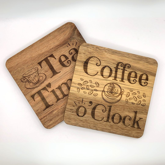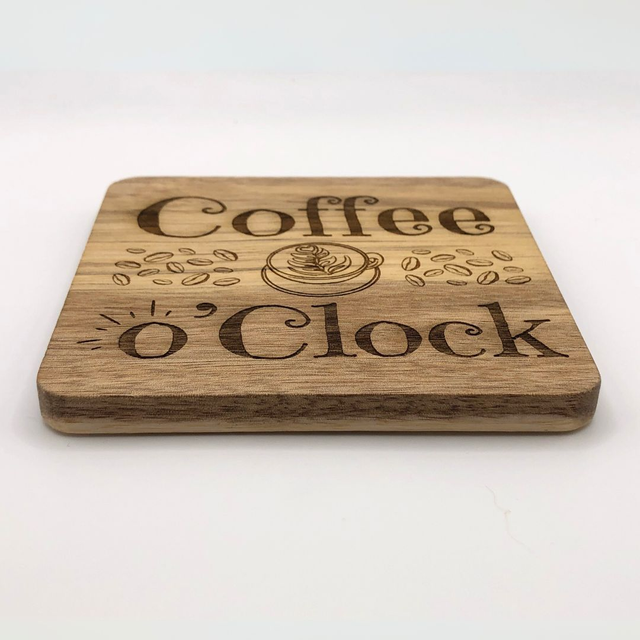 Onderzetter van Acacia-hout, met een gegraveerde afbeelding.