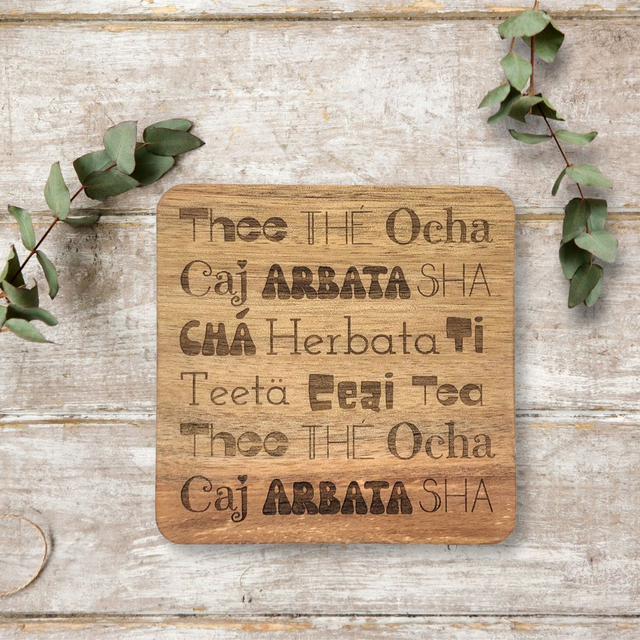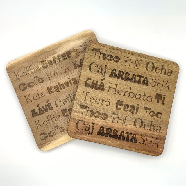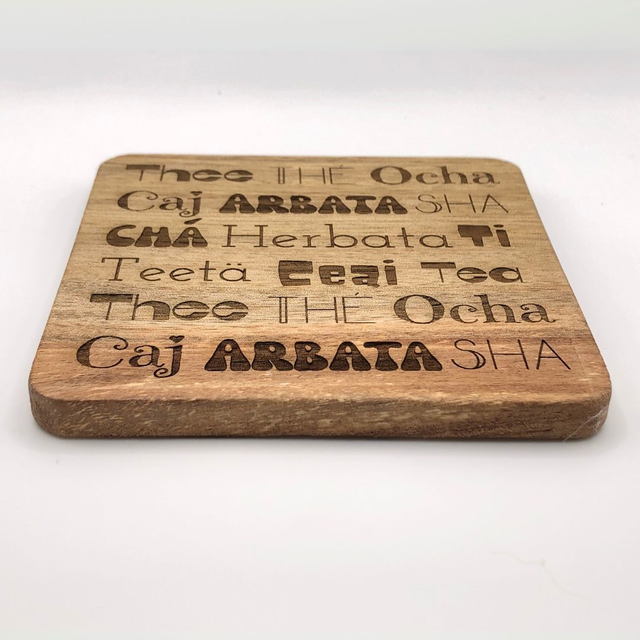Onderzetter van Acacia-hout, met een gegraveerde afbeelding.
